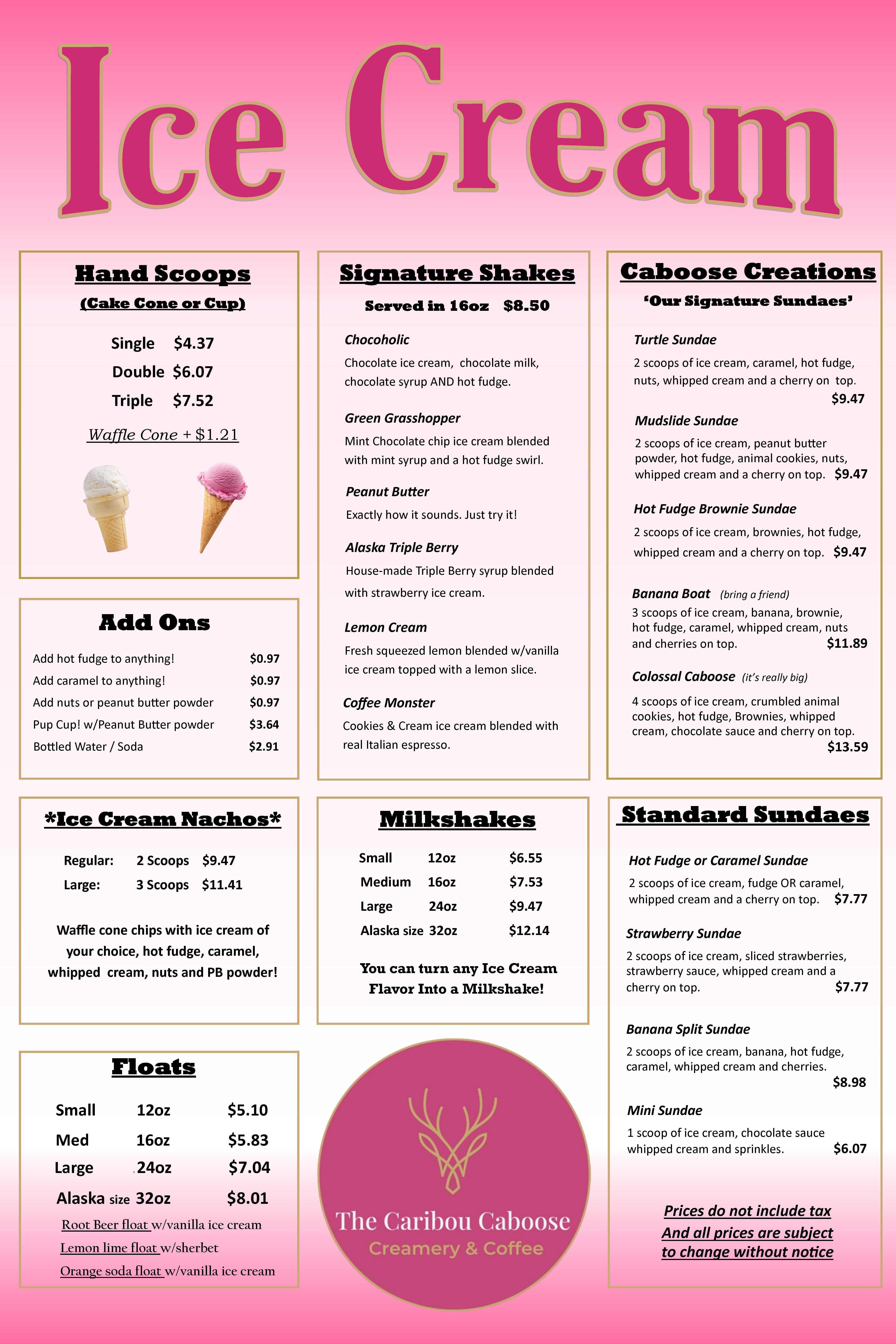 We serve the Kenai Peninsulas finest milkshakes, sundaes, hand scooped ice cream, root beer floats, banana splits, and espresso! Now open year round! Come check us out, and soak up summer at The Caribou Caboose!